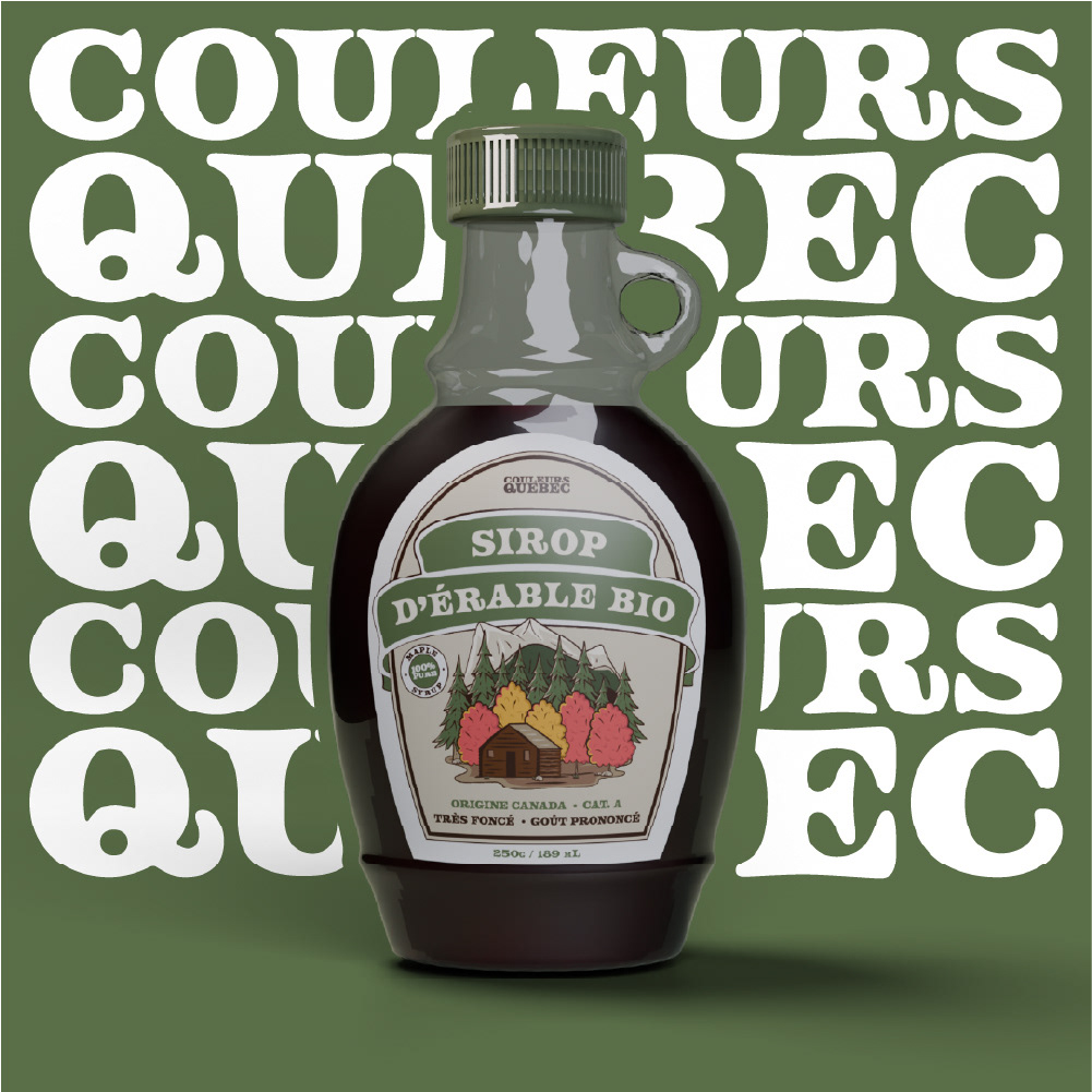 Refonte de marque et packaging pour Couleurs Québec, une marque qui propose un sirop d'érable "très foncé", appellation officielle de ce sirop au "goût prononcé", disponible en GMS en version conventionnelle et bio. Leur identité était vieillissante et leurs bouteilles avaient du mal à sortir du lot en rayon, alors nous avons travaillé sur une approche illustrée, avec des couleurs vives et inspirées de l'été indien du Canada. Modélisation 3D et création des scènes avec Blender.