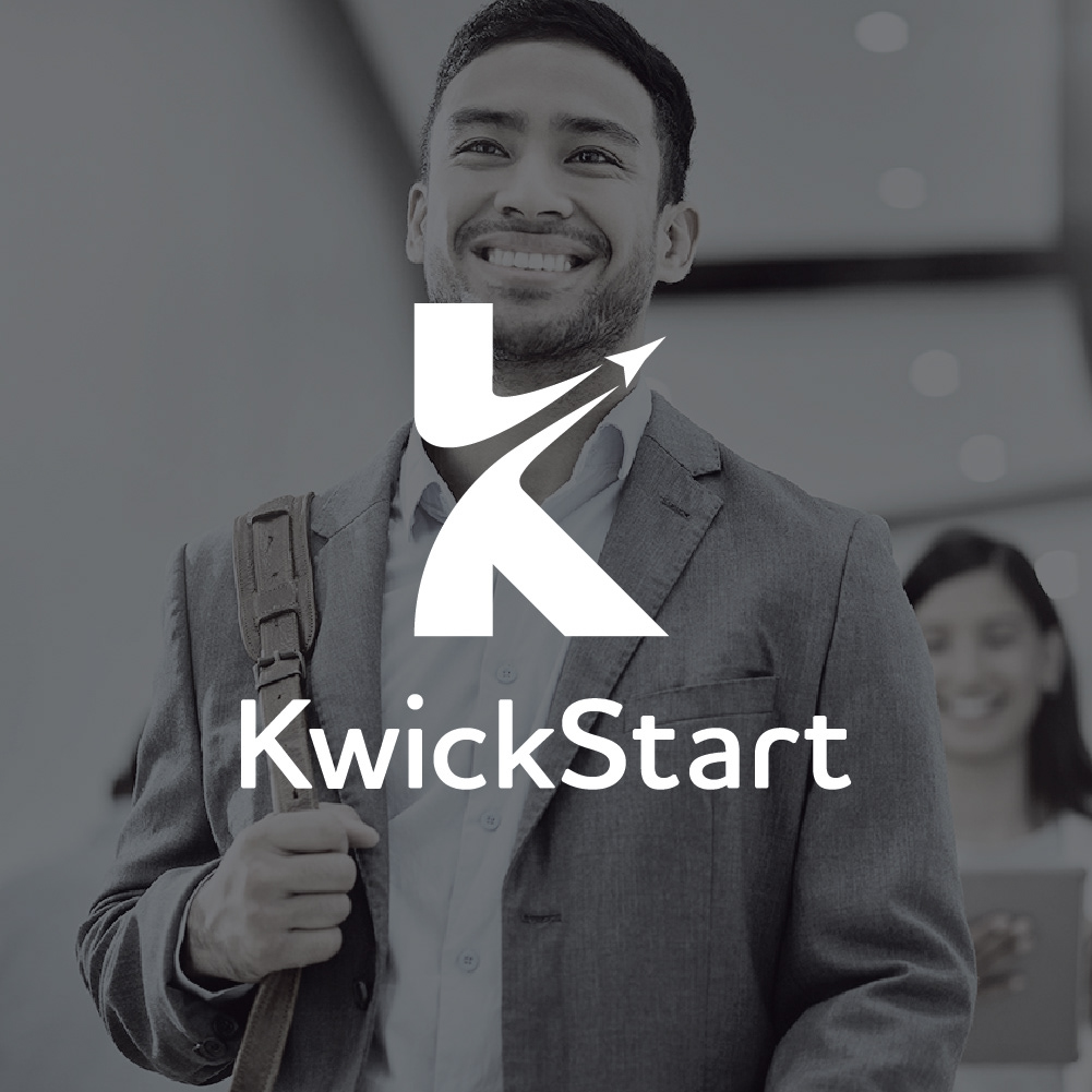 Kwickstart est une société de portage salarial. Le nom évoque le principe du départ, d'une nouvelle carrière qui se lance, d'un décollage, représentés dans ce logo.